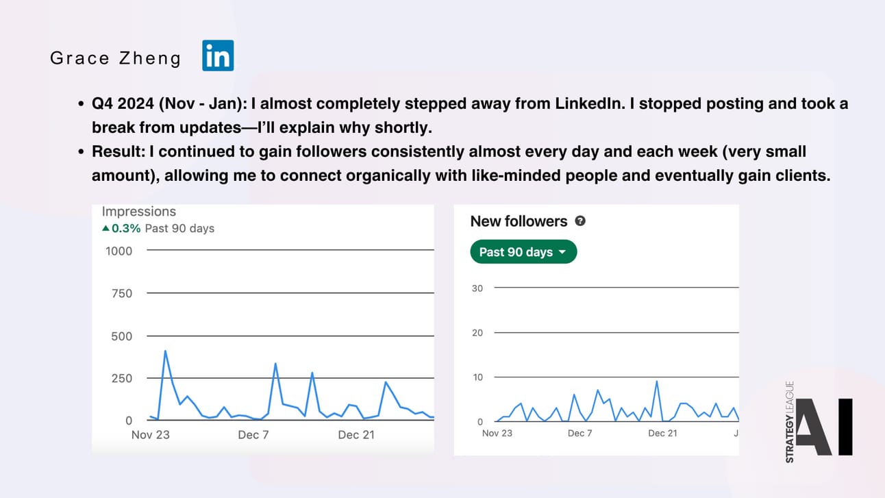 In Q4, I completely stepped away from LinkedIn due to some key reasons - I continued to gain followers consistently every day and each week, allowing me to connect organically with like-minded people and eventually gain clients.